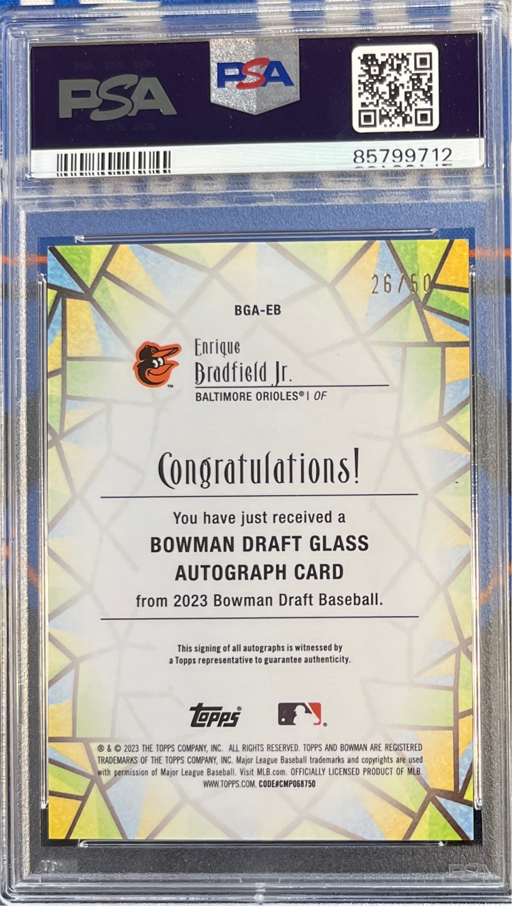 2023 Bowman Draft Enrique Bradfield Jr Glass AU-GOLD 26/50 Mini Diamond PSA 10