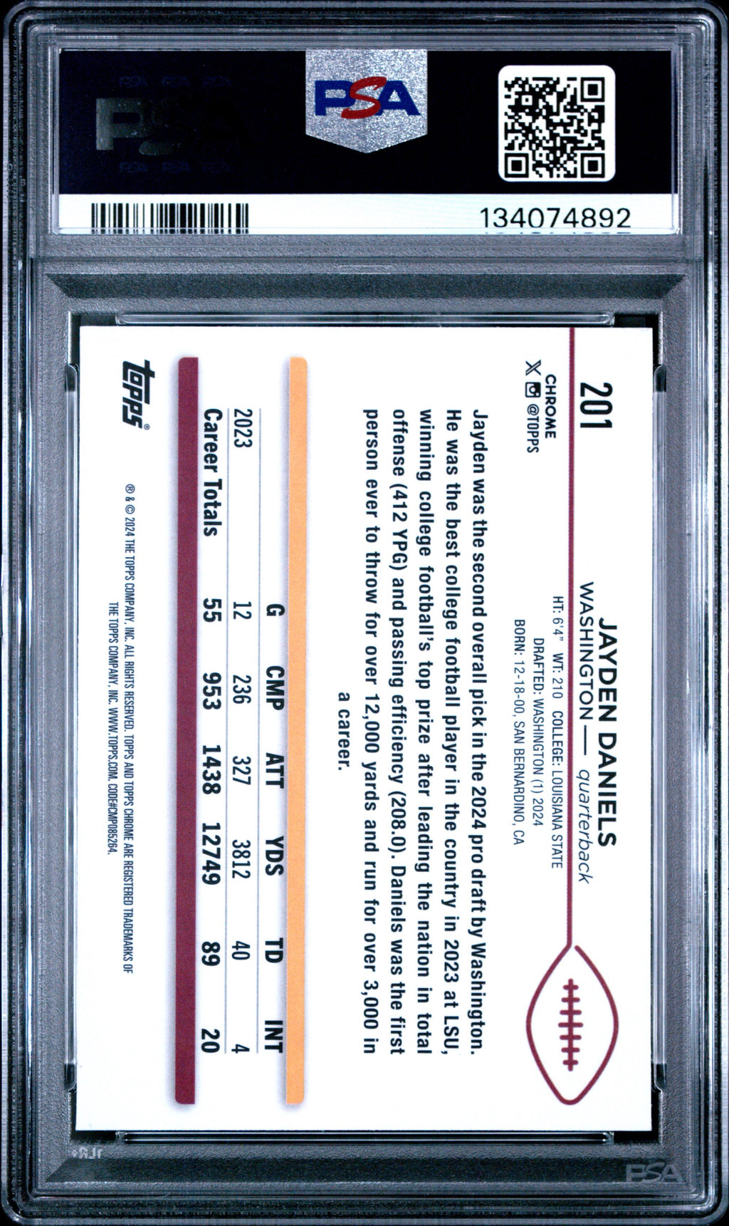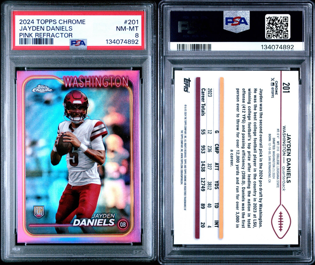 2024 TOPPS CHROME #201 JAYDEN DANIELS PINK REFRACTOR PSA 8